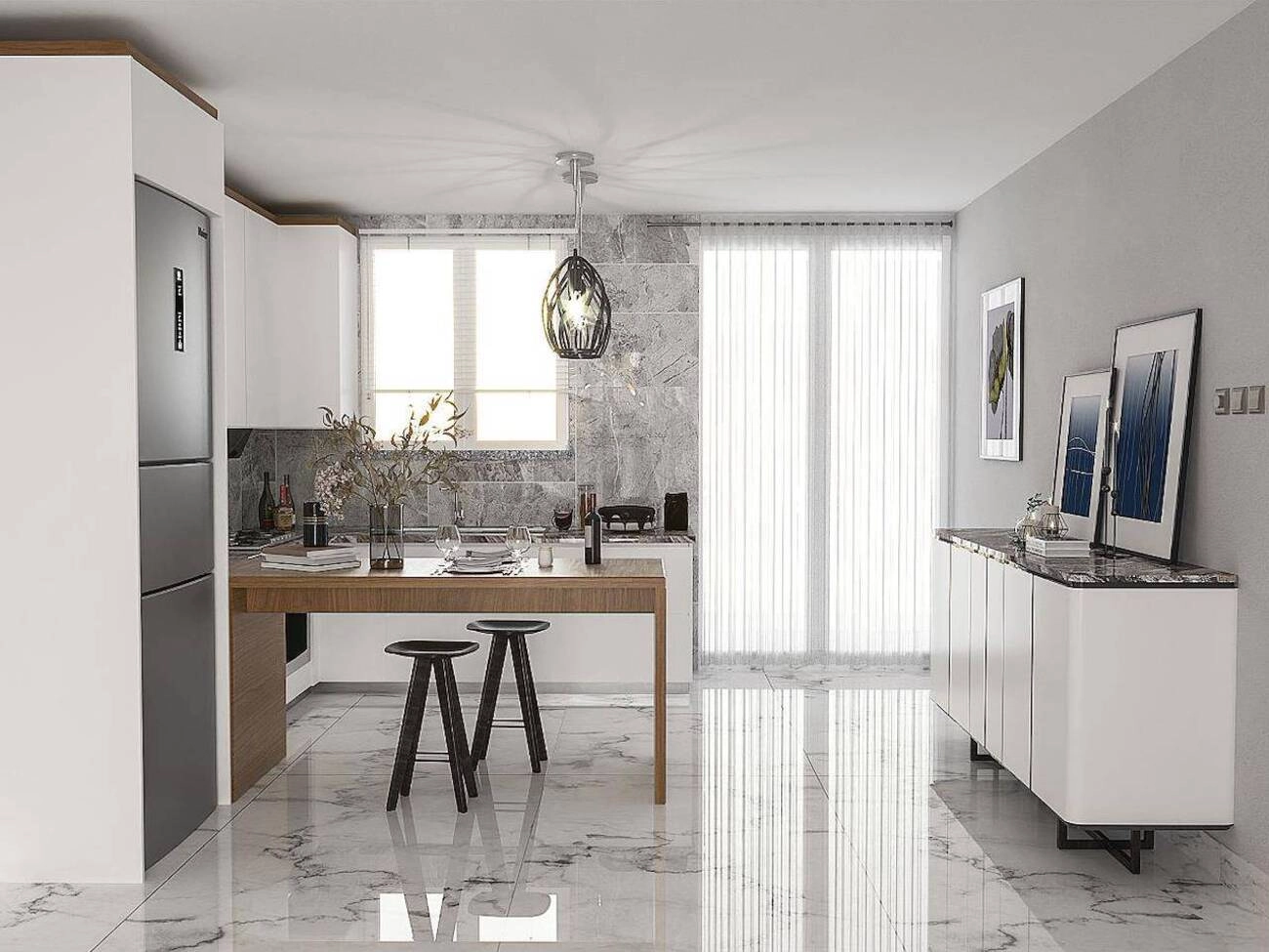 Diese Wohnung zeichnet sich durch eine durchdachte architektonische Gestaltung aus, bei der das Leben im Freien und die natürliche Belüftung im Vordergrund stehen.