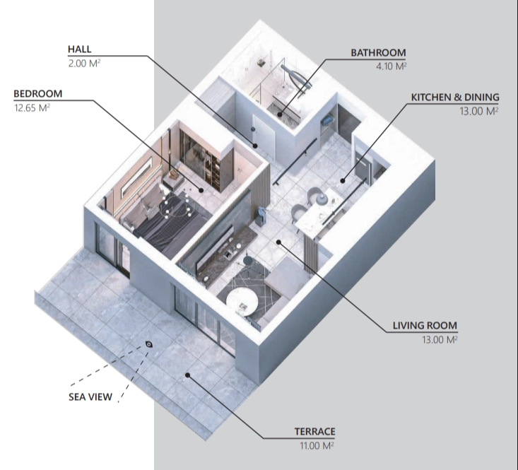 Entdecken Sie die perfekte Harmonie von Komfort und mediterraner Eleganz in dieser atemberaubenden 1-Zimmer-Wohnung in der renommierten Key West-Anlage. Eingebettet in der ruhigen und sich schnell entwickelnden Küstenregion von Gaziveren, bietet diese Immobilie einen erstklassigen Lebensstil, der durch spektakuläre Meerblicke und modernes architektonisches Design definiert wird.