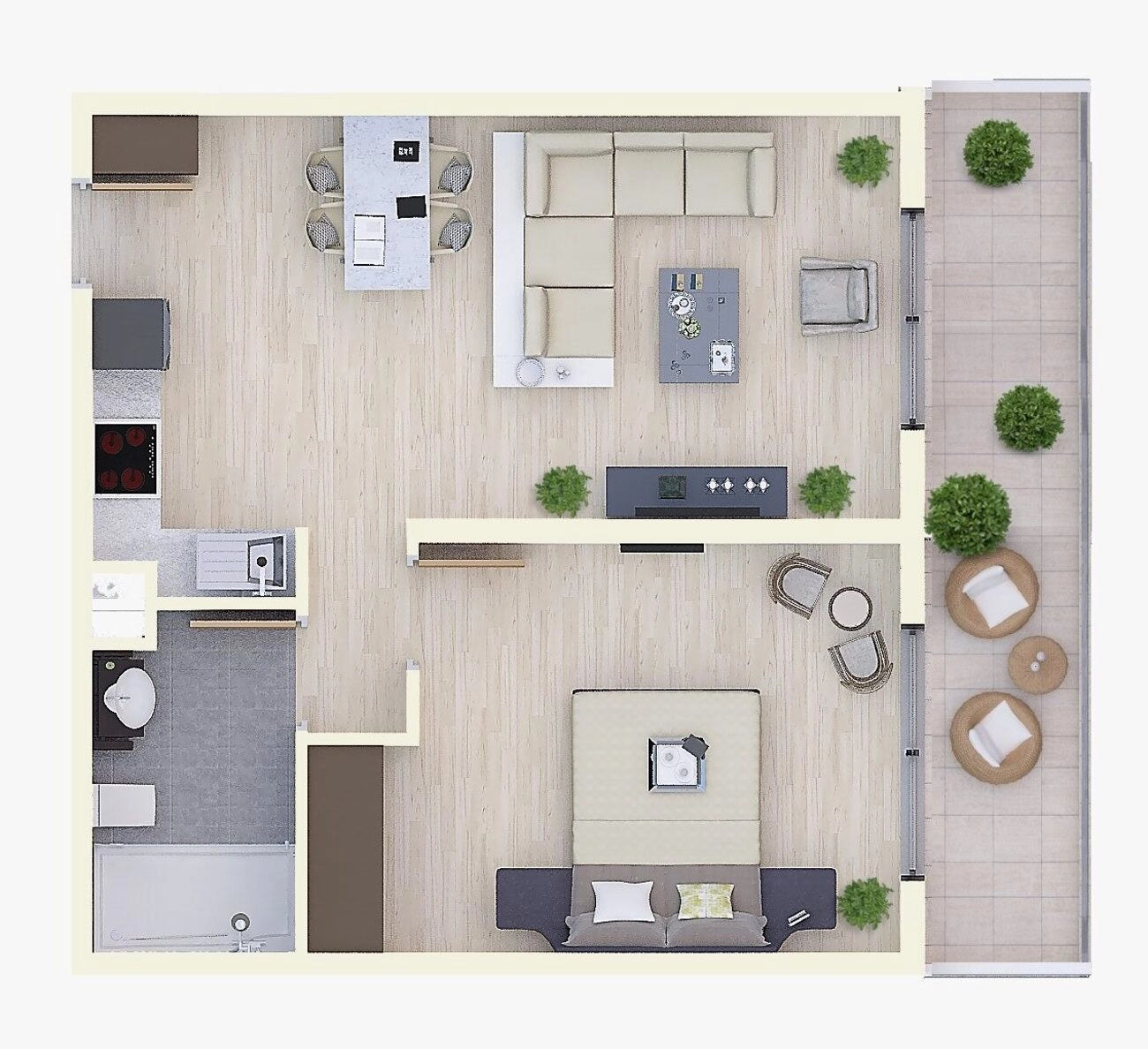 Geräumiger Balkon: Ein herausragendes Merkmal dieses Grundrisses ist der große, terrassenartige Balkon, der sowohl vom Wohnzimmer als auch vom Schlafzimmer aus zugänglich ist und sich perfekt für Mahlzeiten im Freien oder zum Entspannen in der mediterranen Sonne eignet.