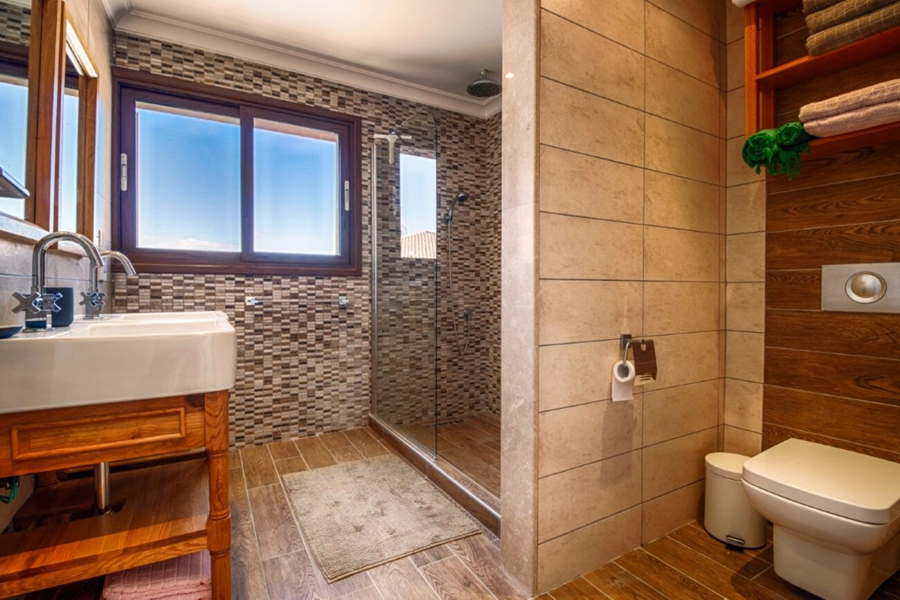 Erdgeschoss: Das Herzstück des Hauses ist ein geräumiges 36 m² großes Wohnzimmer, das nahtlos in einen 14 m² großen Essbereich und eine funktionale 18 m² große separate Küche übergeht. Auf dieser Ebene befinden sich auch ein separates Schlafzimmer (15,5 m²), ein Flur, ein Gäste-WC und ein komplettes Badezimmer. Große Glastüren führen vom Wohnzimmer und der Küche auf eine riesige 40 m² große offene Terrasse und eine zweite 50 m² große Terrasse, die an den Pool angrenzt.