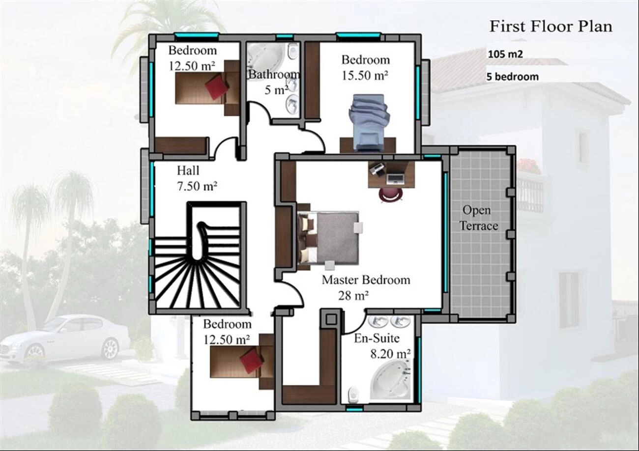 Erster Stock: Ein wahres Refugium der Ruhe, das vier weitere Schlafzimmer beherbergt. Ein Highlight ist die 28 m² große Master Suite, die über ein 8,20 m² großes eigenes Bad und einen begehbaren Ankleidebereich verfügt. Zwei der Schlafzimmer sind 12,50 m² groß, während das vierte geräumige 15,50 m² groß ist.