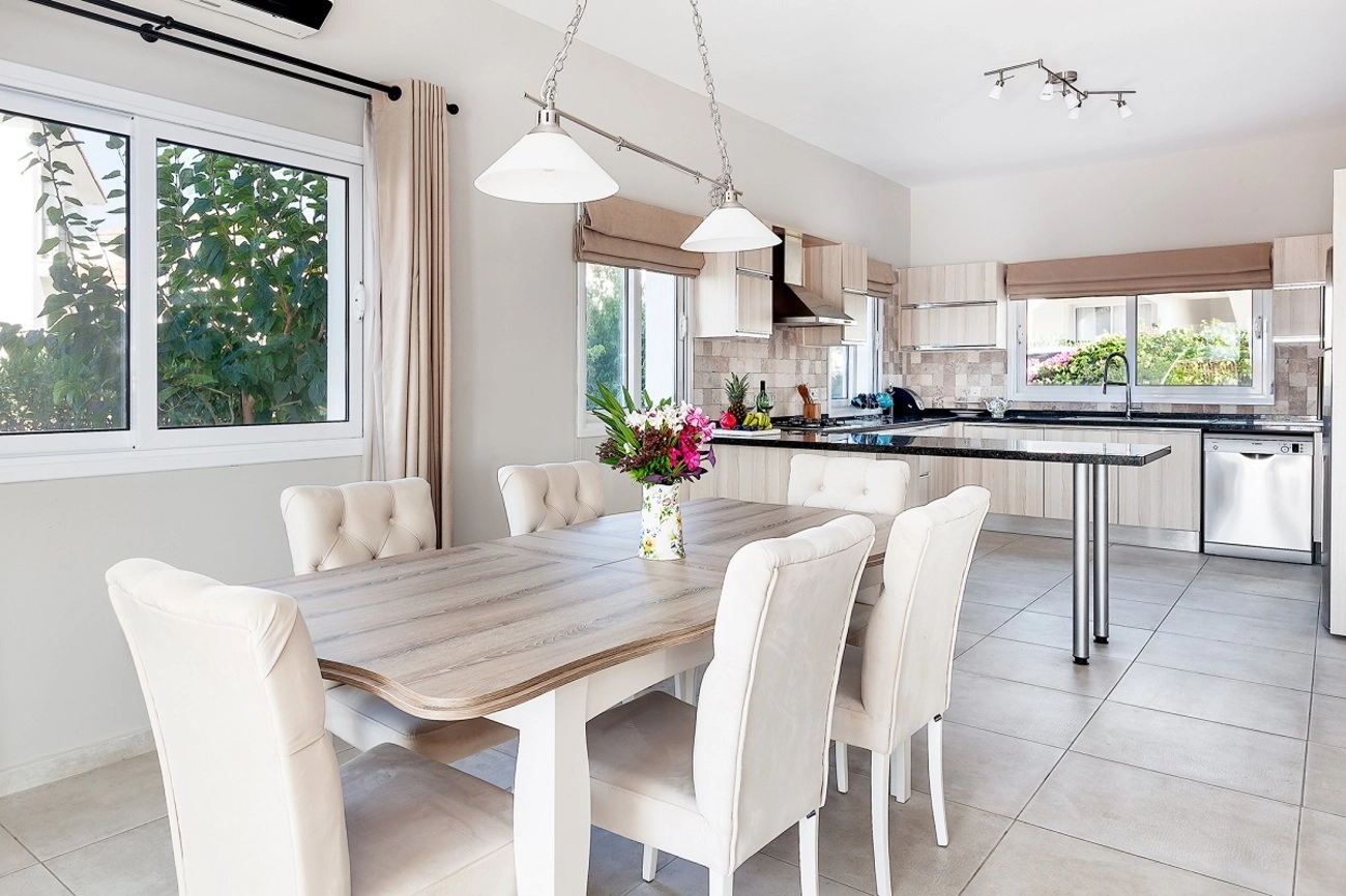 Erdgeschoss: Das Haus verfügt über einen großen offenen Wohn- und Essbereich mit architektonischen Bögen, die zu einer großen Terrasse und einem privaten Swimmingpool führen. Auf dieser Ebene gibt es ein eigenes Gästeschlafzimmer, eine moderne Küche und einen direkten Zugang zum Garten.