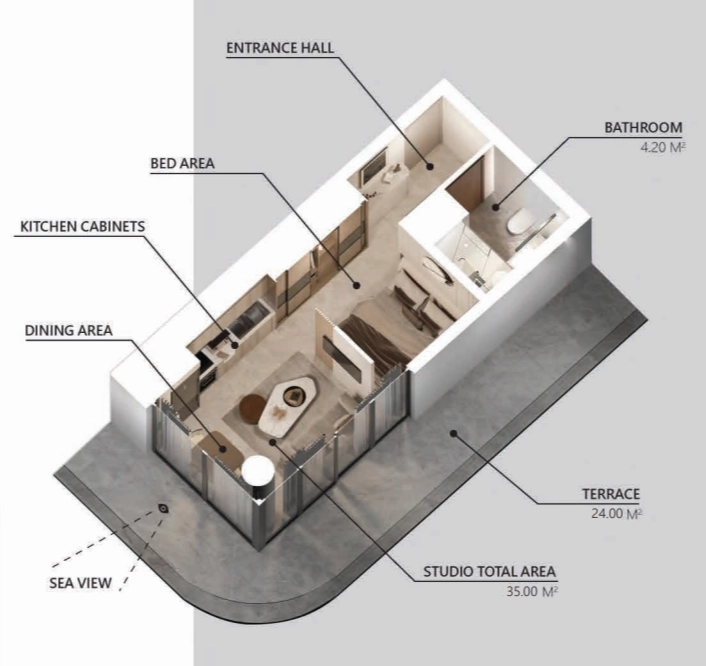 Dieses durchdachte Studio maximiert jeden Quadratmeter, um ein geräumiges, offenes Wohnumfeld zu schaffen. Das Layout ist intelligent unterteilt, um Komfort und Fluss zu gewährleisten: