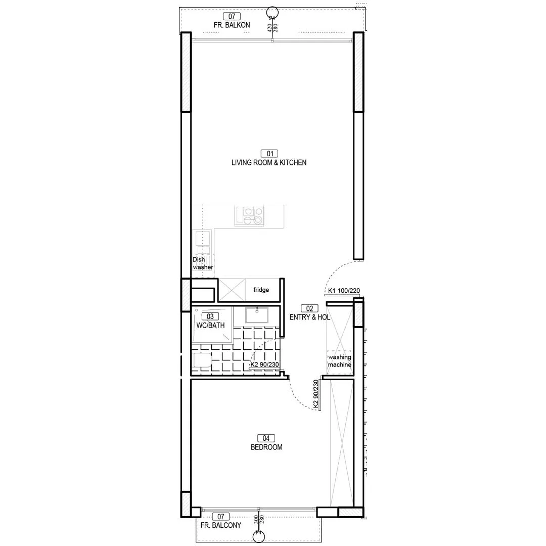 The apartment features a linear, well-zoned floor plan that ensures a comfortable flow between private and social spaces: