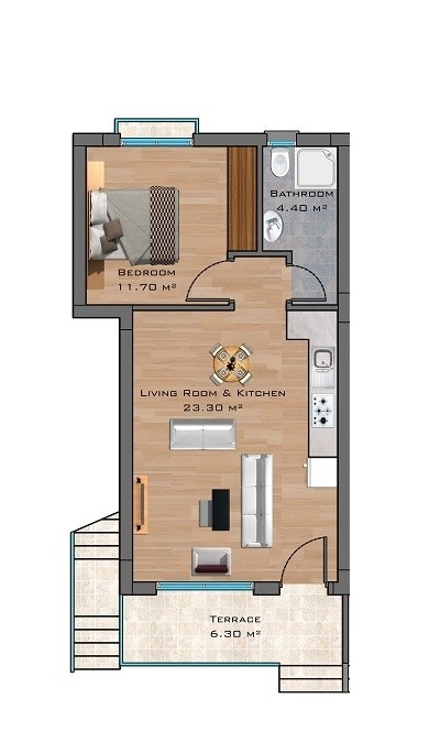 • Living Room & Kitchen: A bright and spacious 23.30 sqm open-plan area that serves as the social hub of the home, offering plenty of room for both dining and relaxation.