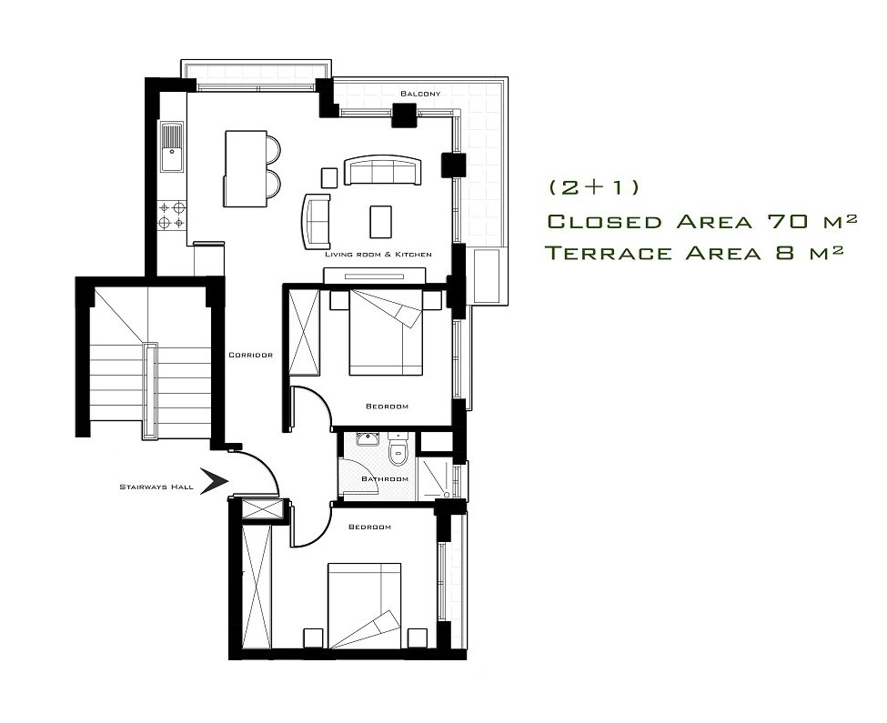 Terrace & Views: A private 8 m² balcony/terrace wraps around the living area. Large floor-to-ceiling glass doors ensure the apartment is flooded with natural light and offer a seamless transition to the outdoors for fresh city breezes.