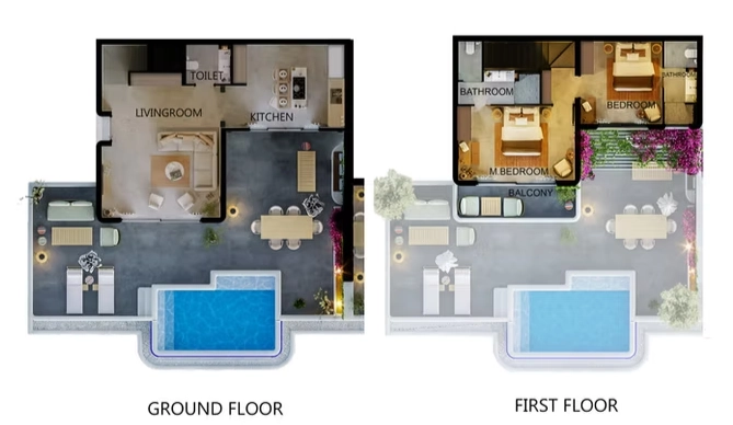 The villa’s layout is meticulously planned across two floors to provide a perfect balance between social interaction and private relaxation: