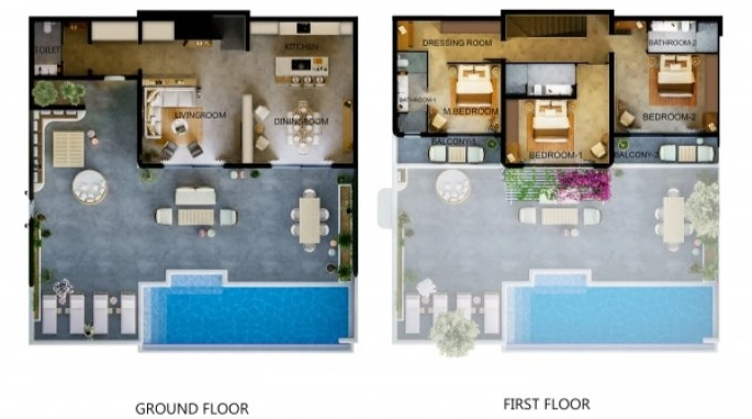 First Floor (The Private Sanctuary): This level houses three impressive bedrooms, including a 26 sqm Master Bedroom with a dedicated dressing room and a 6 sqm private bathroom. Two additional spacious bedrooms (21.50 sqm and 26 sqm) are supported by two further modern bathrooms (7 sqm and 6 sqm).