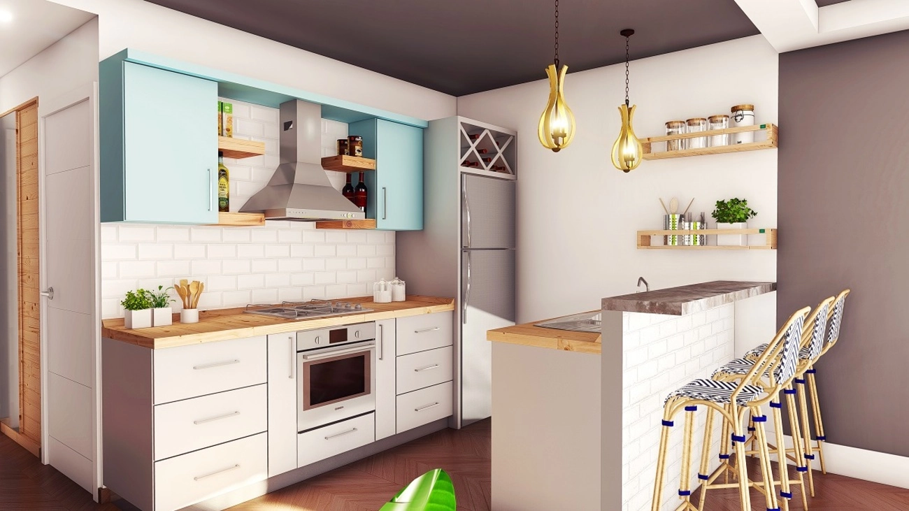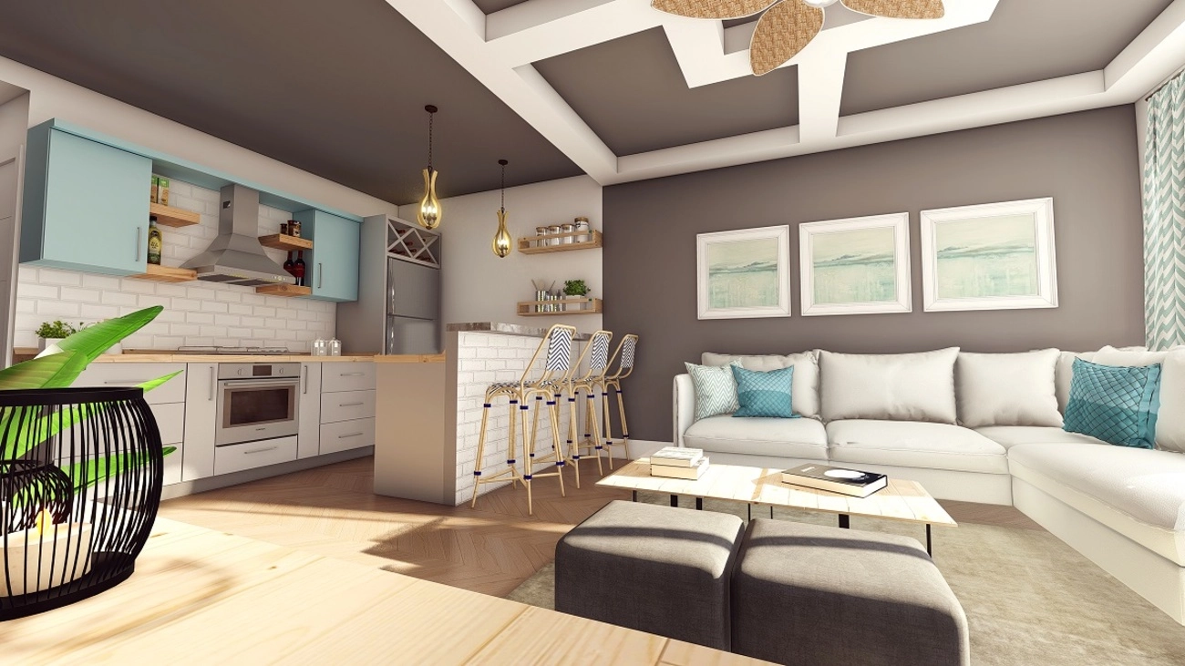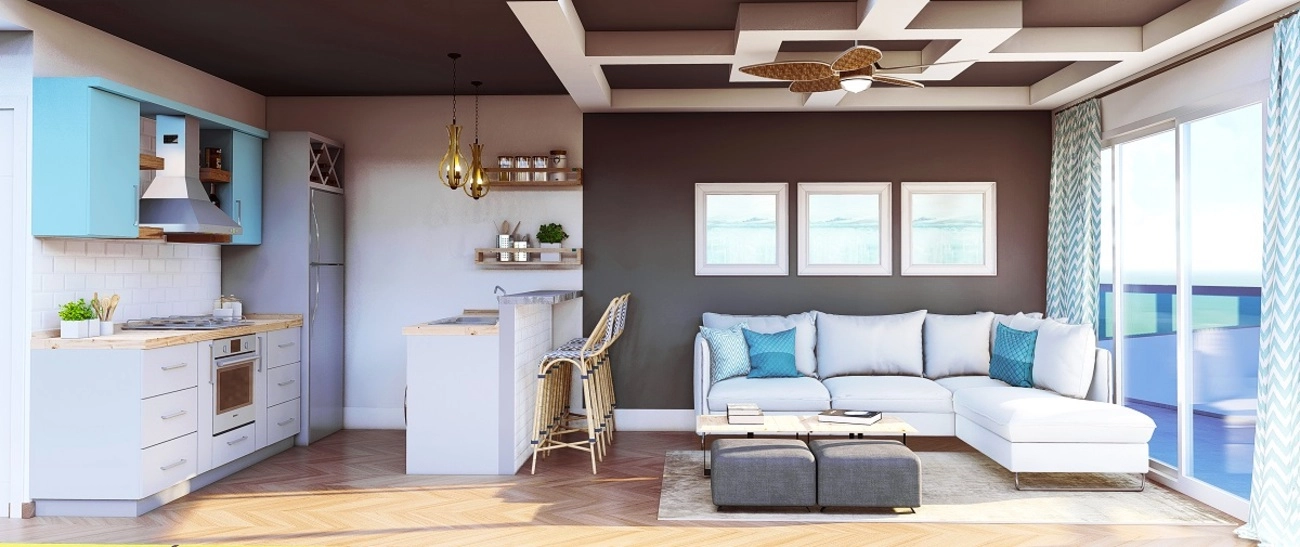 • Integrated Living & Dining: The core of the home features a sleek kitchen zone with a built-in breakfast island/dining bar for three, seamlessly flowing into a generous lounge area with a comfortable L-shaped sofa.