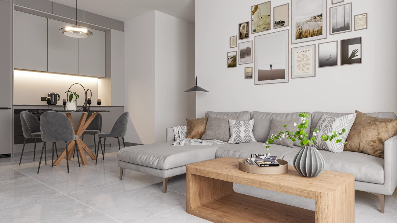 Obszar społeczny: Jasna, otwarta kuchnia i salon zaprojektowane z myślą o nowoczesnym komforcie. Kuchnia ma ergonomiczny kształt litery U ze zintegrowanym stołem jadalnym, który wygodnie mieści cztery osoby.