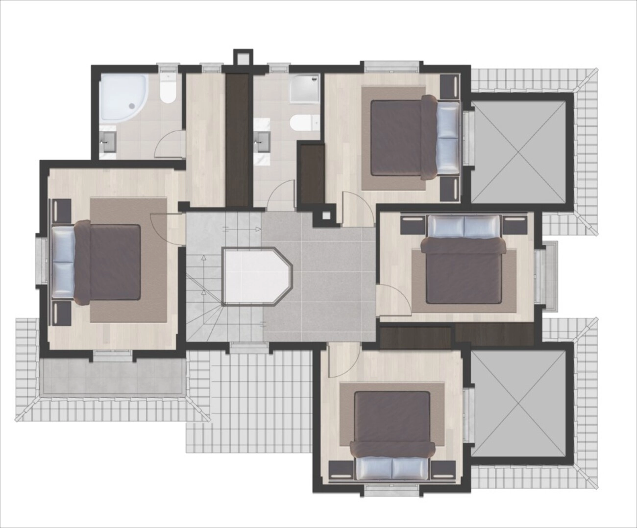 Pierwsze piętro (kwatera prywatna): Mieści cztery przestronne sypialnie skupione wokół jasnego podestu. Główny apartament jest prawdziwym sanktuarium, z wydzieloną garderobą i prywatną łazienką. Druga rodzinna łazienka i wiele prywatnych balkonów obsługują pozostałe sypialnie, zapewniając komfort dla całego gospodarstwa domowego.