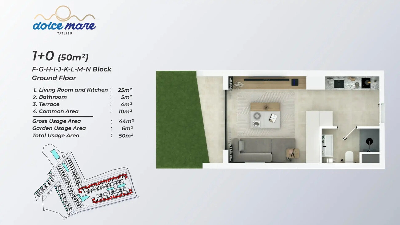 Poznaj idealne połączenie śródziemnomorskiego uroku i nowoczesnego designu dzięki temu stylowemu apartamentowi typu studio w prestiżowym kompleksie mieszkaniowym Dolce Mare. Osiedle to, położone w spokojnej i malowniczej okolicy Tatlisu na Cyprze Północnym, słynie z zapierających dech w piersiach widoków na morze i nietkniętego naturalnego piękna. Nieruchomość oferuje łączną powierzchnię 50 m², składającą się z 35 m² powierzchni mieszkalnej netto i przestronnego prywatnego tarasu o powierzchni 8 m², zapewniając wyrafinowane schronienie dla osób ceniących nadmorski styl życia.