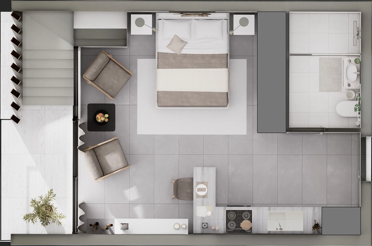 The Living Zone: Profesjonalnie zorganizowane studio na otwartym planie, które łączy w sobie nowoczesną kuchnię, dedykowaną jadalnię / bar śniadaniowy oraz wygodną część sypialną. Zastosowanie dużych, sięgających od podłogi do sufitu szklanych drzwi sprawia, że przestrzeń jest skąpana w naturalnym świetle i zapewnia bezpośredni widok na horyzont.