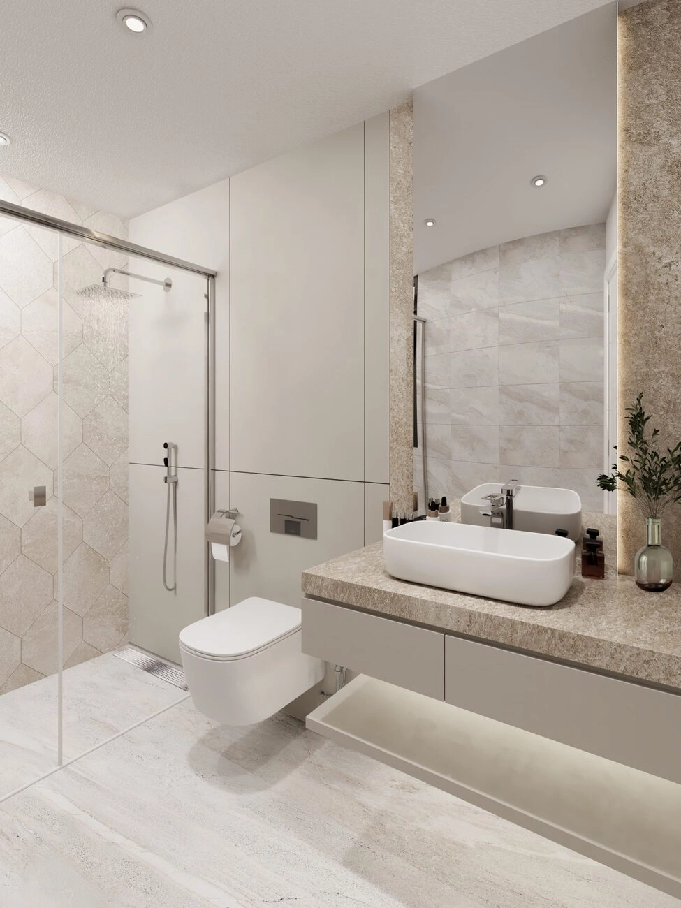 Üst Kat (Özel Asma Kat): En üst katta yer alan gözlerden uzak ana yatak odası süiti, alt kata bakan manzarasıyla hacim ve "çatı katı" lüksü hissi yaratıyor.