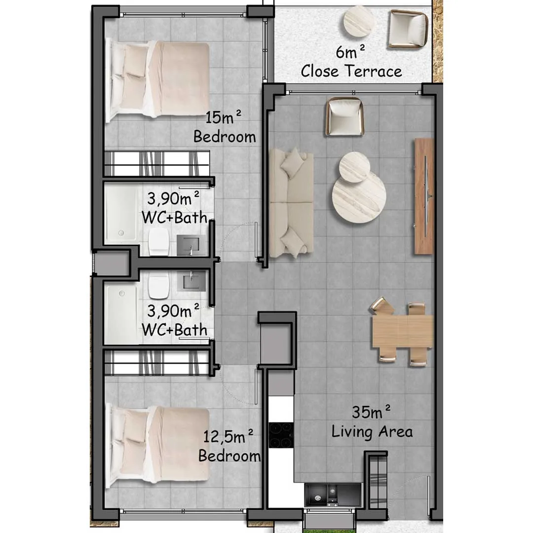 Çift Ana Yatak Odası: Biri 15 m², diğeri 12,5 m² olan iki büyük, izole yatak odası bulunmaktadır. Yaşam alanının karşı taraflarında yer almaları maksimum akustik mahremiyet sağlamaktadır.