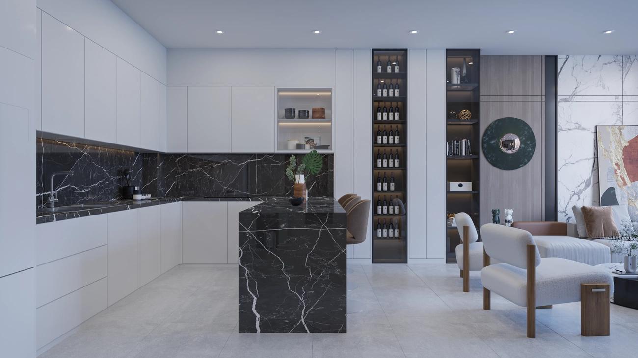 Daire, mahremiyet, akış ve üst düzey estetiğe öncelik veren ustaca planlanmış bir düzene sahiptir: