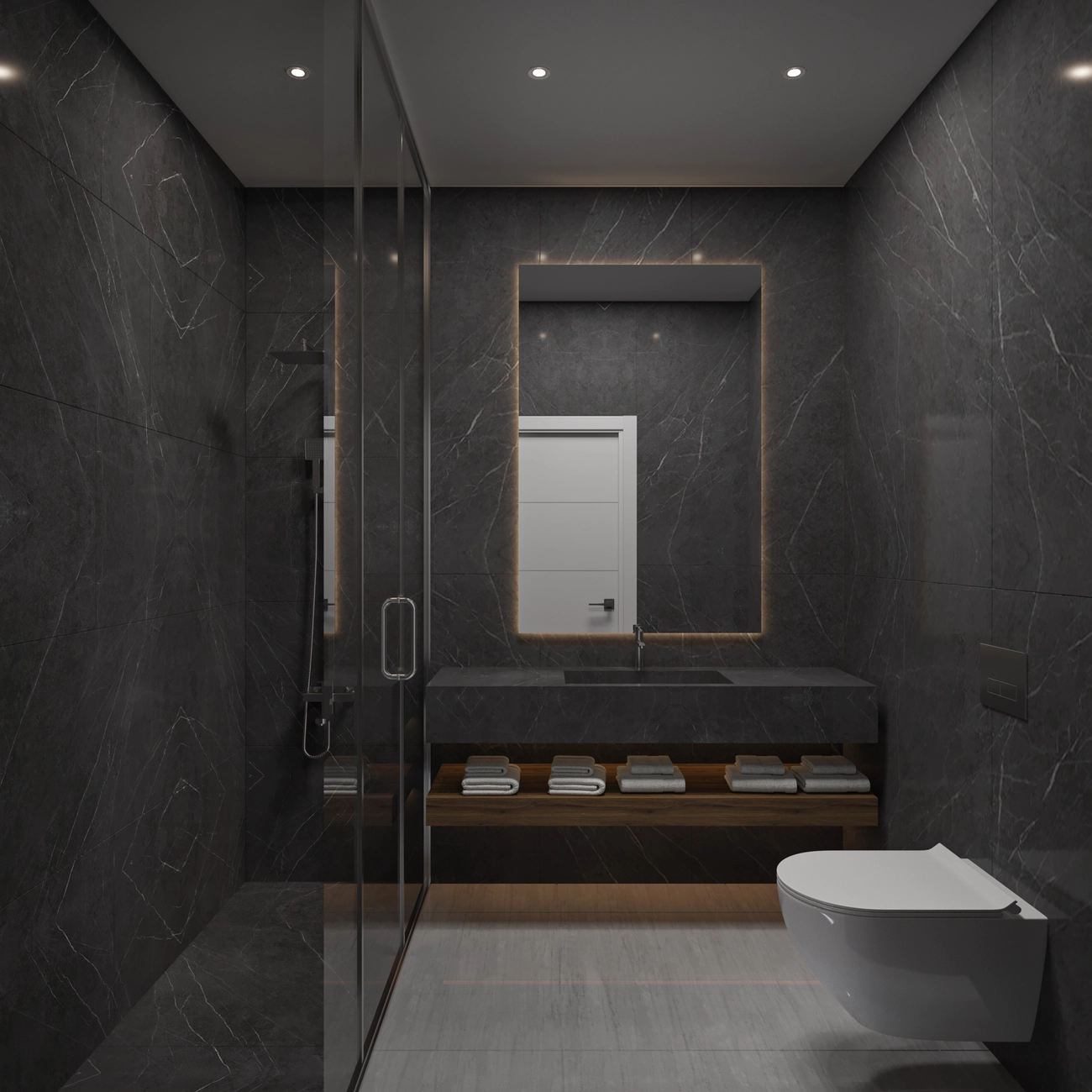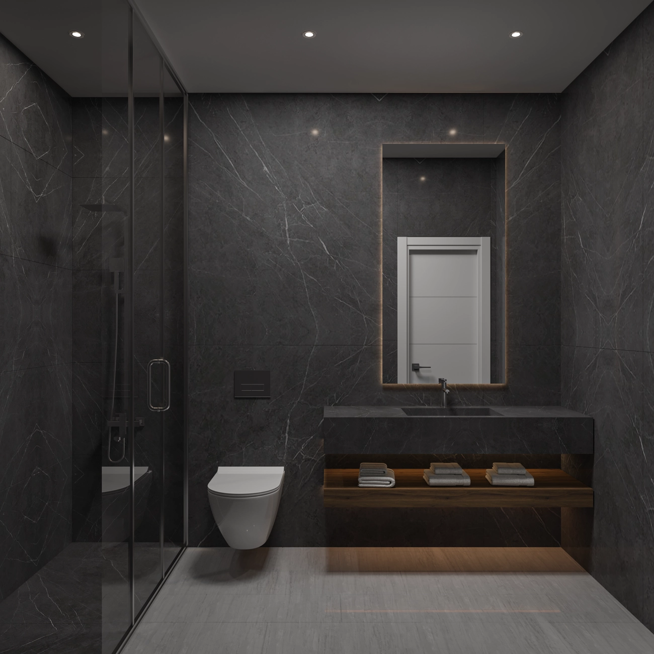 İki Modern Banyo: Konutta, birinci sınıf koyu mermer efektli fayanslara ve geniş bir ev halkını rahatça ağırlayabilecek şık duşakabinlere sahip şık tasarımlı iki banyo bulunmaktadır.