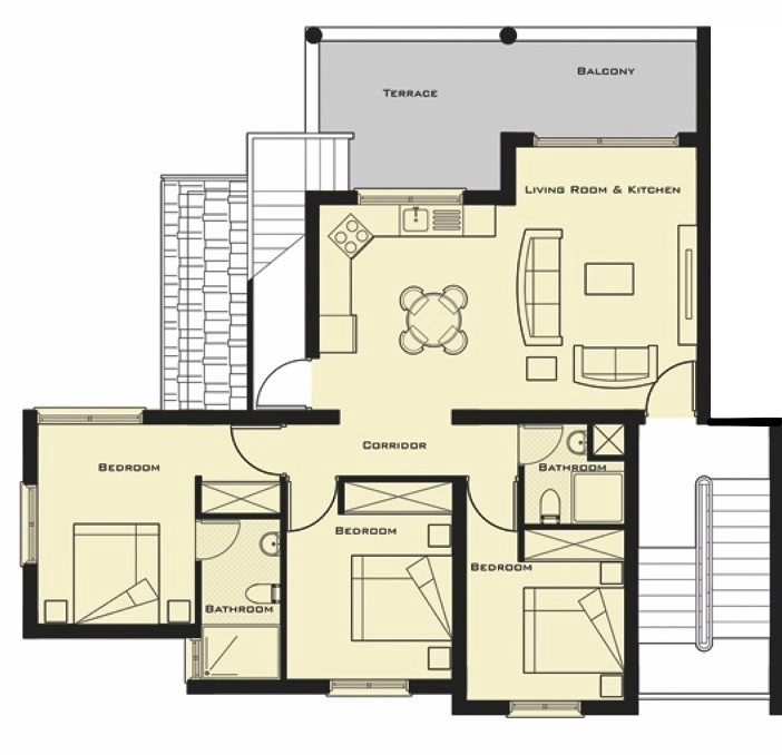 Alt Kat (Yaşam ve Uyku): Birinci kat, aile toplantıları için ideal olan geniş bir açık plan "Oturma Odası ve Mutfak" alanına sahiptir. Bu kat, kendi özel "Banyosu" olan bir ana süit de dahil olmak üzere üç izole yatak odasına ev sahipliği yapmaktadır. İkinci bir "Banyo", diğer yatak odalarına ve misafirlere hizmet vermek üzere merkezi "Koridor "un dışında elverişli bir konumda yer almaktadır.